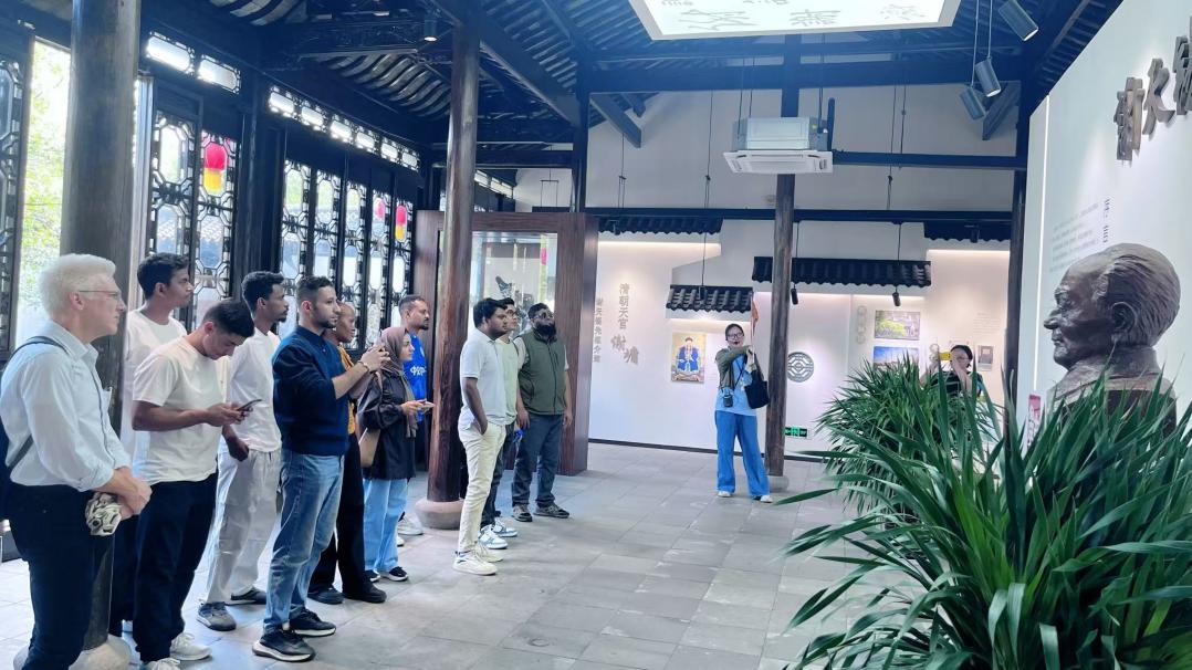 外籍师生漫步于枫泾古镇的青石板路,先后参观了谢天锡艺术馆、江南水乡婚俗馆等地,小桥流水、白墙黛瓦的景致,以及保存完好的传统建筑,让他们直观感受到江南地区独特的历史风貌与文化传承。
